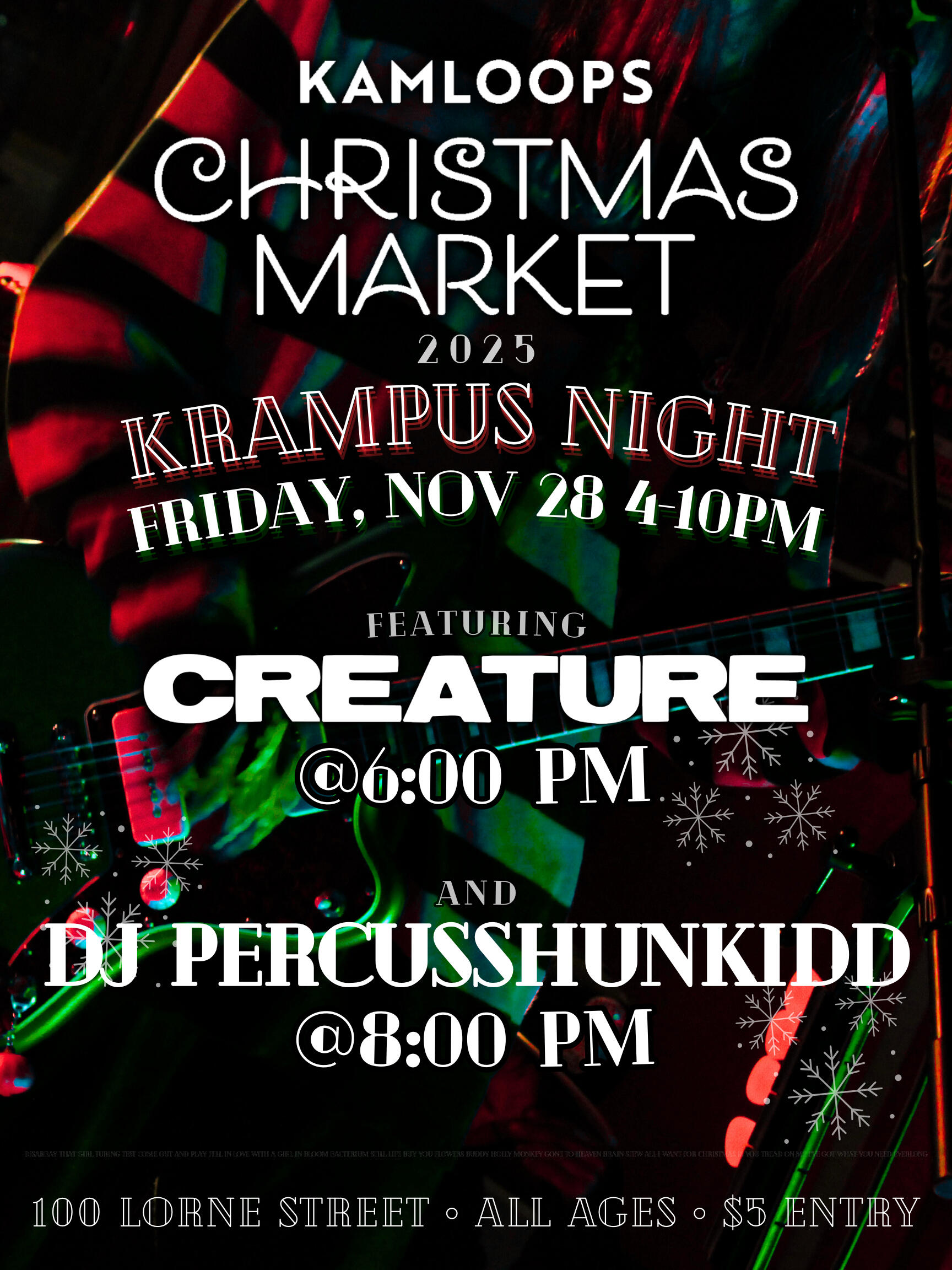 Get Ready for a Magical Mischief-Filled Night at the Kamloops Christmas Market!Prepare for a delightfully wild twist as Kamloops Krampus takes over the Market! From 4 to 10pm, visitors can expect a festive blend of cheer, folklore, and just a hint of playful fright as wandering Krampuses roam the village, spreading laughter, posing for photos, and adding a whole lot of unique excitement to the night.At 5pm, the Kamloops Krampus crew will join the big man, Santa himself, for an unforgettable holiday moment: the official Krampus Takeover with Santa! From 5 to 6pm, families can enjoy photos with both Santa and Krampus together — a one-of-a-kind holiday keepsake. Then from 6 to 8pm, the photo fun continues with Krampus solo sessions for anyone wanting a spookier seasonal selfie.Kids and families will also love the crafts and games running from 5 to 8pm, bringing hands-on creativity and festive play to the marketplace.The Village will stay lively all evening with live music and dancing, featuring the incredible local band CREATURE and the high-energy mixes of DJ PercusshunKidd. Whether you’re browsing vendors, taking in the sights, or dancing by the tree, you’ll feel the magic all night long.Not familiar with Krampus? In Central European folklore, Krampus is the horned companion to St. Nicholas. Where St Nick rewards the well behaved, Krampus takes care of the naughty list, reminding children to stay kind and true during the season.Be sure to also mark your calendars for the Kamloops Krampus Parade and Market on December 6, a full community celebration featuring costumes, storytelling, and local vendors.Come experience the joy, the music, and the mischief — Kamloops Krampus is taking over!